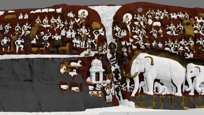 The third component will be the installation of life size paintings with renewed colour of the now washed out but still stunning rock shrines of Mamallapuram. One of the panels known as Arjuna’s Penance in Mamallapuram is a multi-layered image. It is a palimpsest image, a poly-